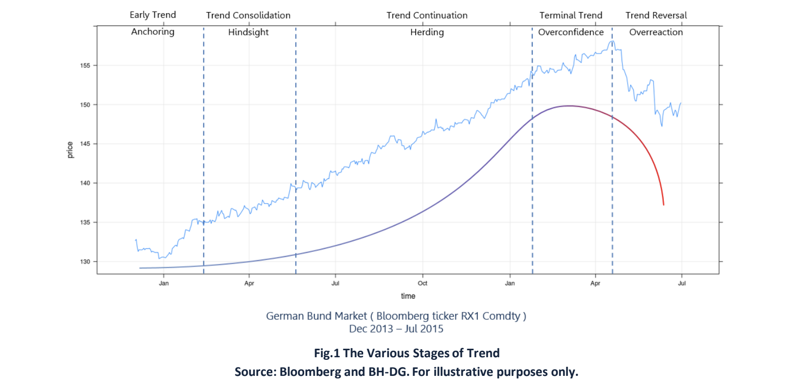 In this note we endeavoured to describe the various stages of market trend according to our school of thought. As presented above, we believe that trend following requires a surgical understanding of the underlying dynamics of the market forces at play. Of particular importance is the acknowledgement and the appropriate timing of the several phases that make up the trend price action and the realization that these phases are vastly different. We conjecture that a good trend following strategy should take into account the individual characteristics of these different phases and produce sufficient resilience in its behaviour as the trend evolves across its various stages. For illustration, the purple profile shown in Fig.1 represents the idealized position sizing mechanism that would characterize a medium-term trend-following strategy which responds appropriately to the various phase transitions. In the anchoring and hindsight phase such a strategy would allocate a relatively small amount of risk to a market exhibiting these phases but increasing the size with time.